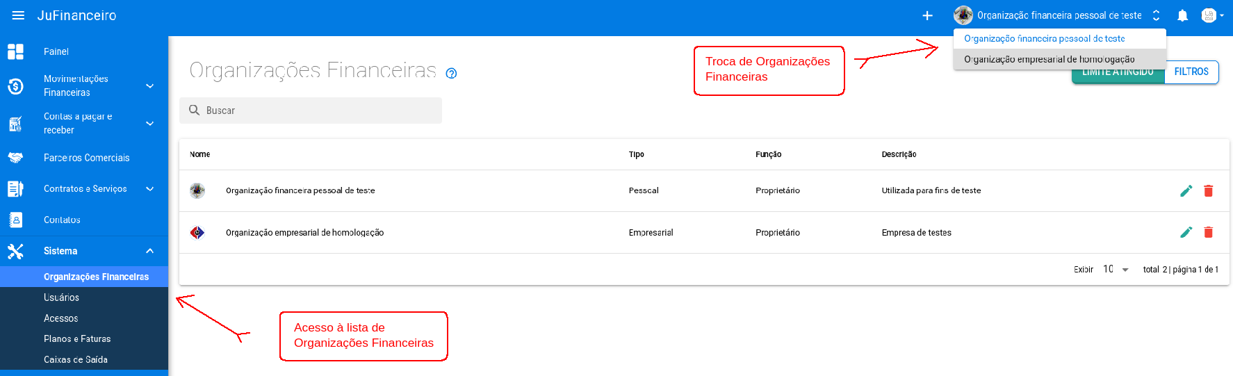 Cada Organização é independente, isolada das demais e possui suas próprias configurações, contas correntes, plano de contas, usuários que acessam, etc.