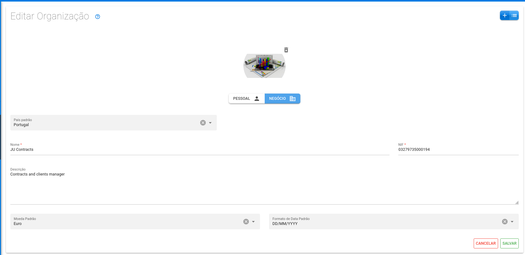 Nas configurações das organizações, dentre outras informações, é possível identificá-la com uma imagem e definir algumas informações padrão como: o país onde as finanças são realizadas, a moeda e o formato de data.