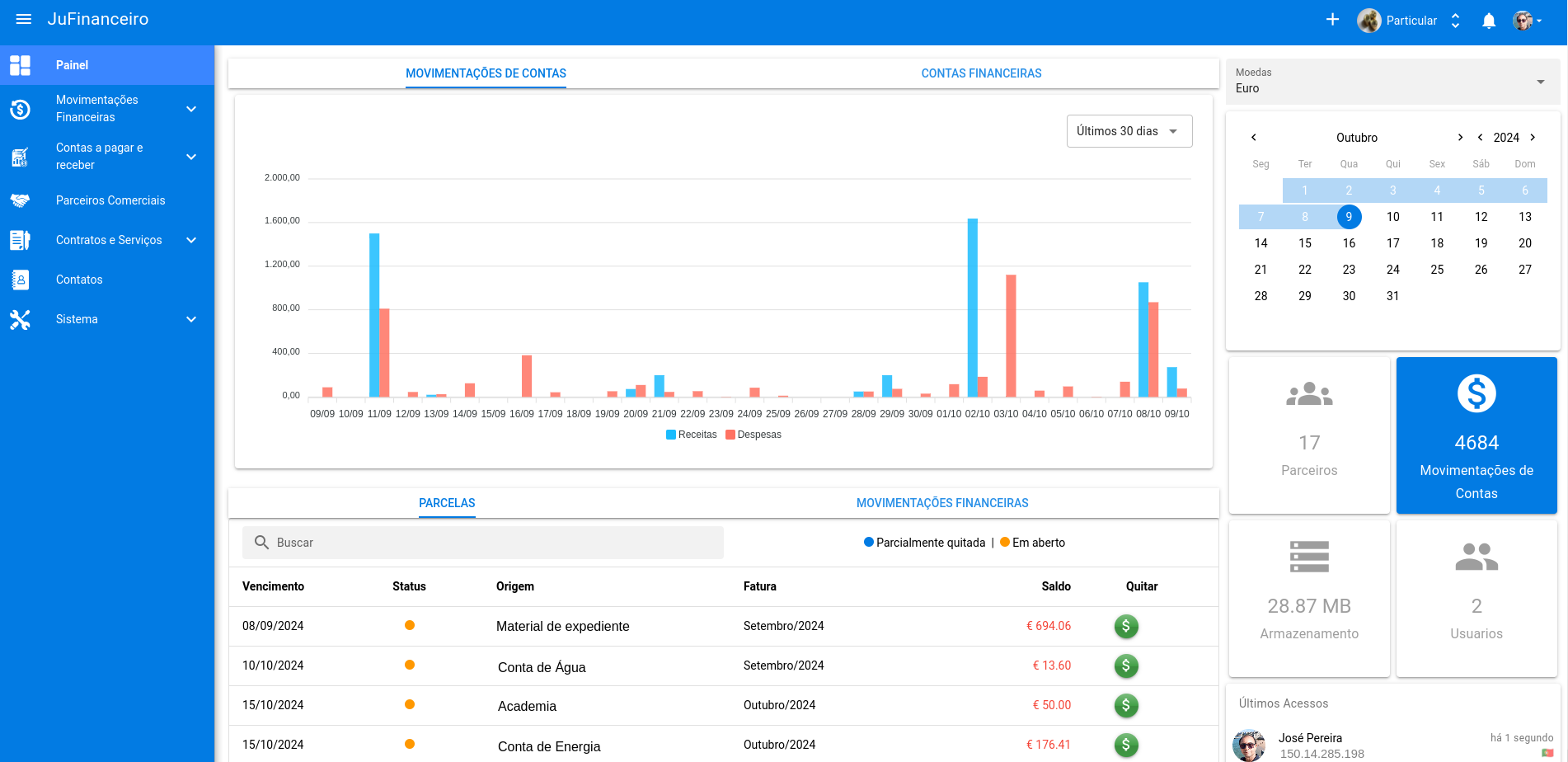 - Movimentações financeiras - São listadas as últimas movimentações financeiras realizadas.