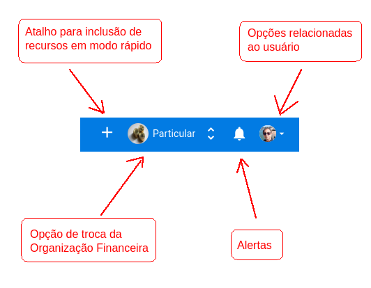- Nas opções de troca de Organização Financeira será possível alternar entre as diferentes organizações financeiras às quais o usuário logado tem acesso. Para saber mais sobre organizações financeiras, clique aqui.