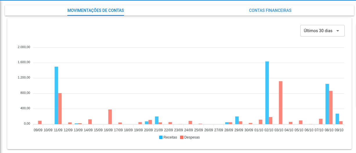 - Movimentações de contas - Exibe as somas de receitas e despesas, separadas por dia de todas as contas financeiras da moeda selecionada.