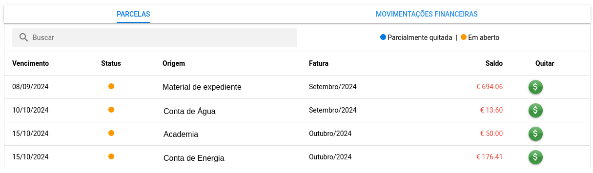 - Parcelas - Na parte inferior do painel principal, são acessíveis as parcelas vencidas e a vencer. As parcelas são listadas em ordem de data de vencimento.