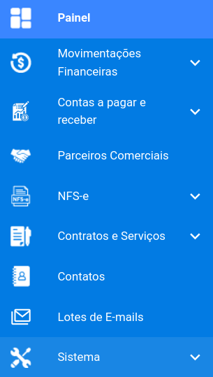 O menu é montado de acordo com os recursos disponíveis para organização financeira pessoal ou empresarial e possibilita o acesso à todas as funcionalidades do sistema através dos menus ou submenus.