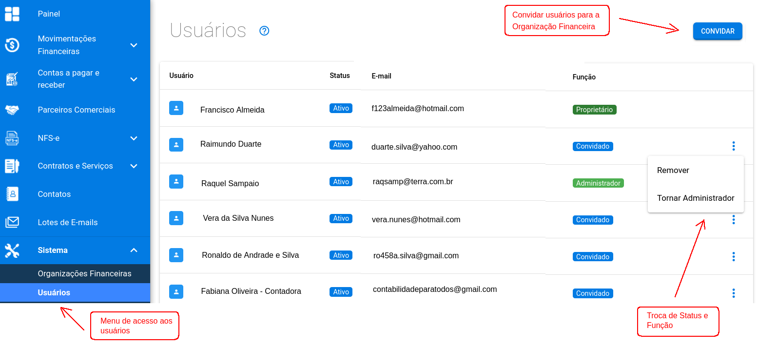 Somente o usuário proprietário da Organização Financeira selecionada tem acesso à página de administração dos usuários.